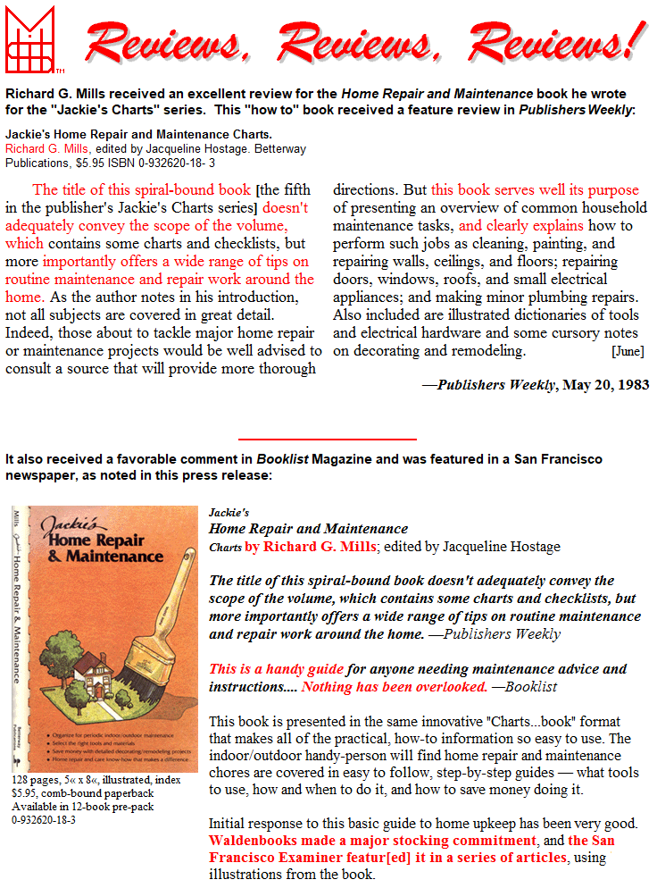 You could visit Angi™ formerly Angie's List for a contractor, but why when you can do it yourself with Mills's complete guide to Home Repair and Maintenance? Well, the answer is: because it's now out of print! However, the above reviews show why you should contact Richard G. Mills when you need a good "how to" writer.