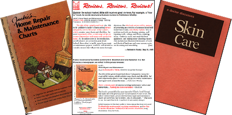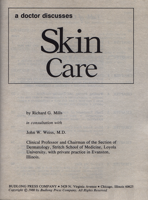 He's not a doctor, but he plays one on.... No, but he's written dozens of healthcare newsletters for spcialities from family medicine to urology to OB-GYN, as well as managed-care articles and house organs, not to mention....well, to spcifically mention also a paperback book you may have seen in drugstore racks, a doctore discuses Skin Care, as shown in the above images of the book's cover and title page. (The "in consultation with" means, he wrote it, and the doctor read it!)